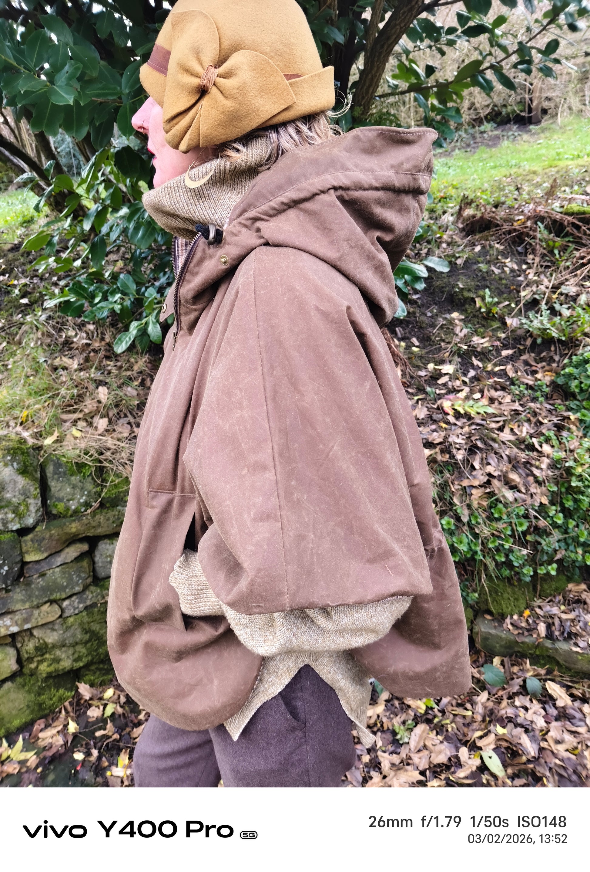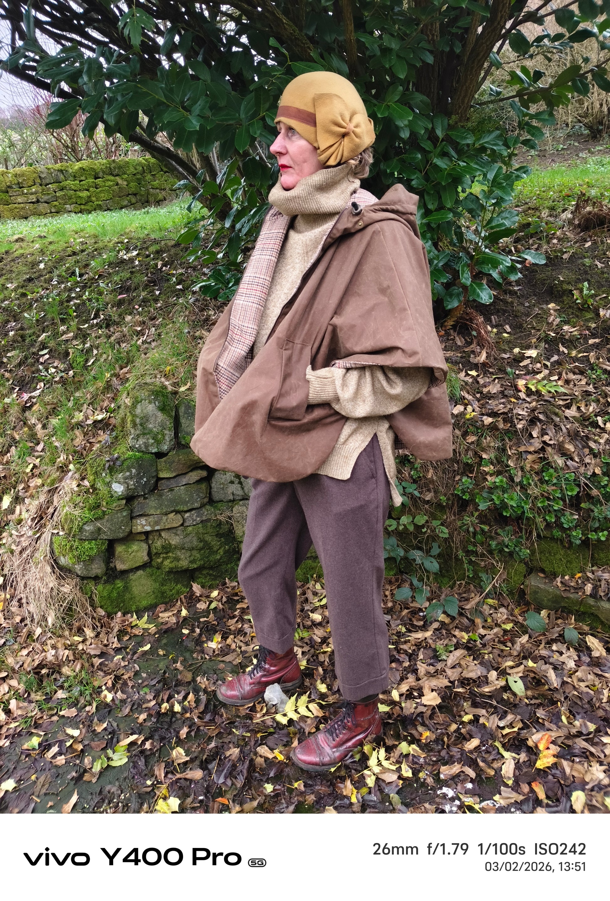 The Calder waxed Cape in Tobacco handcrafted in British Millerain Tekwax weatherproof fabric. Fully lined in a contrasting wool mix check. One size (fits 10-16). Other sizes available on request.